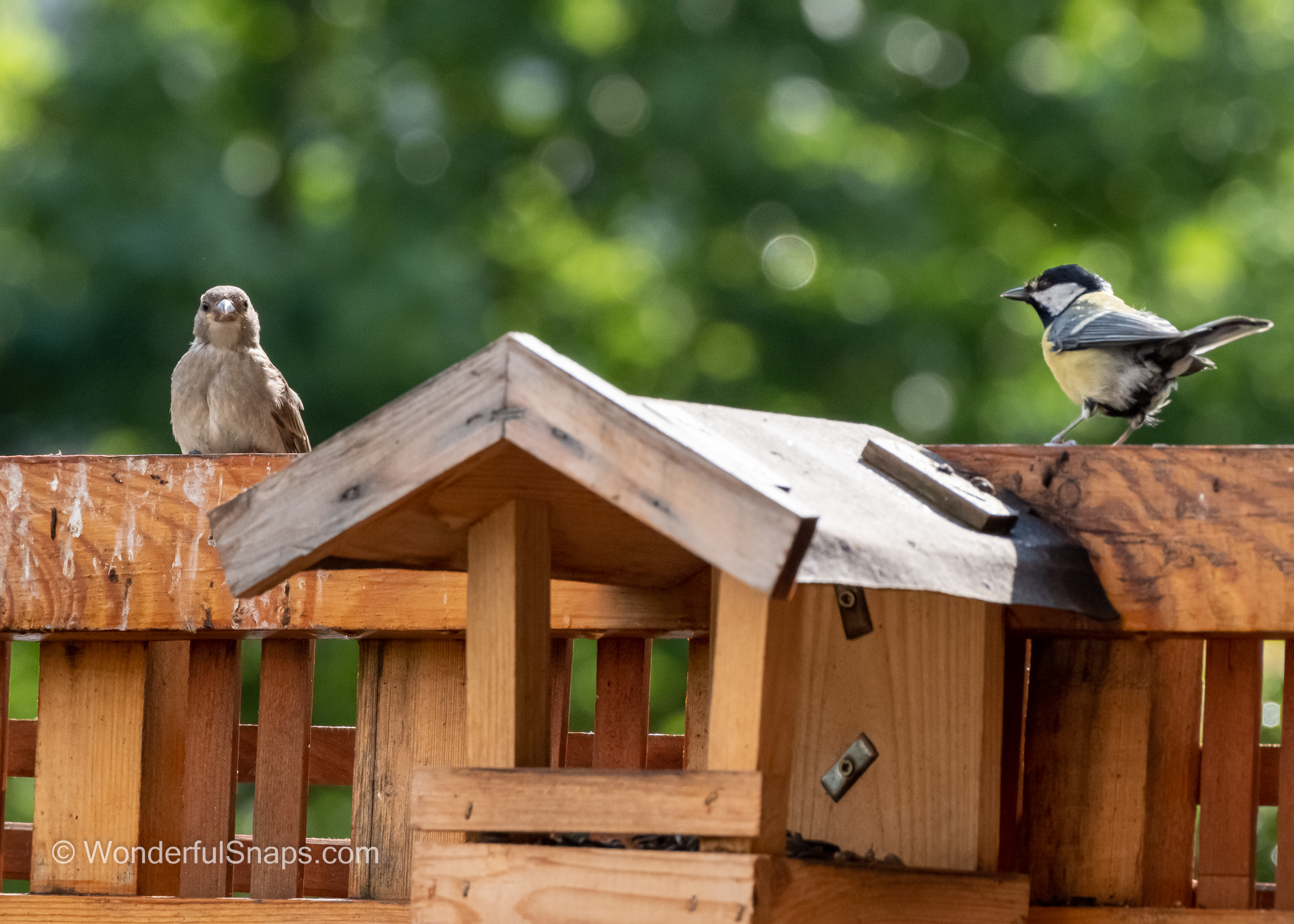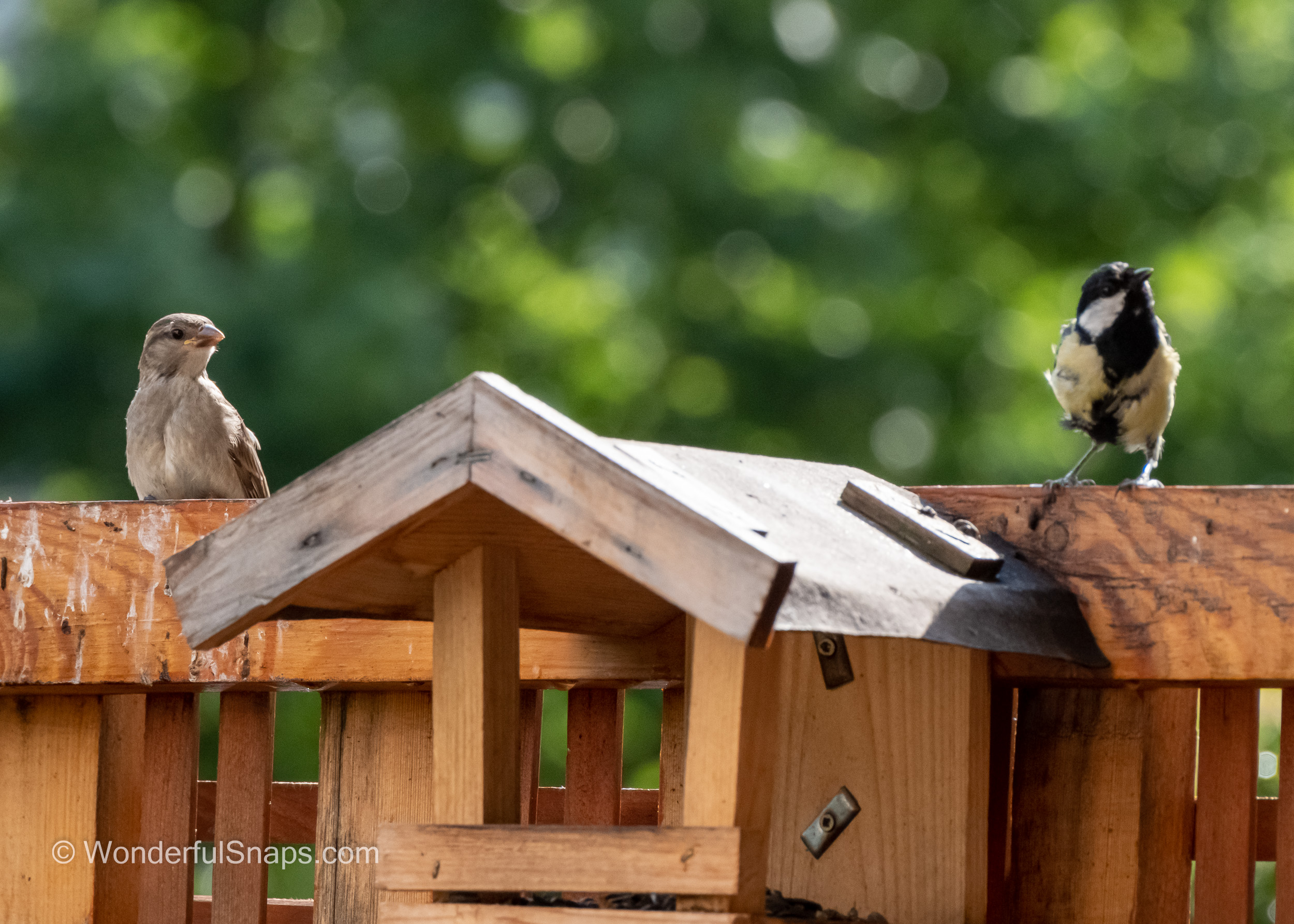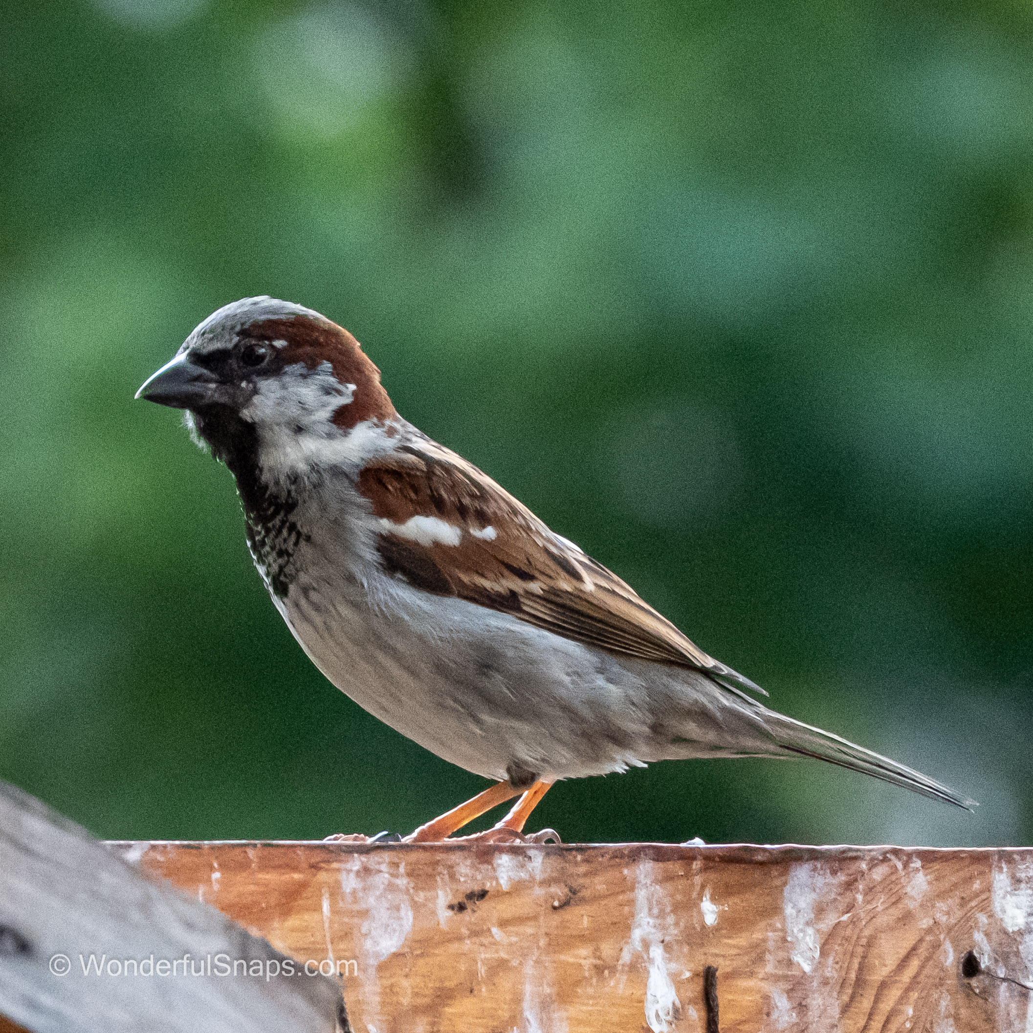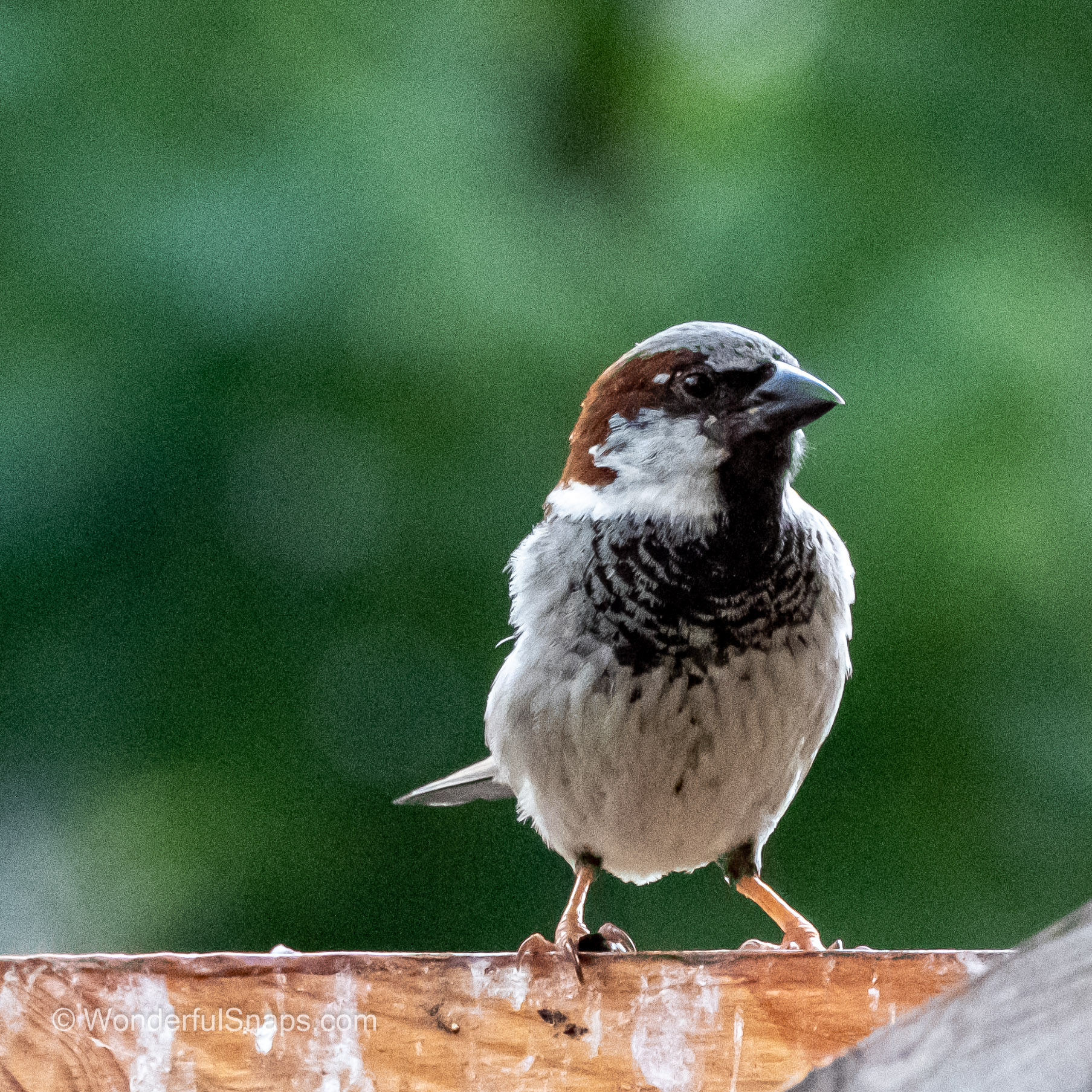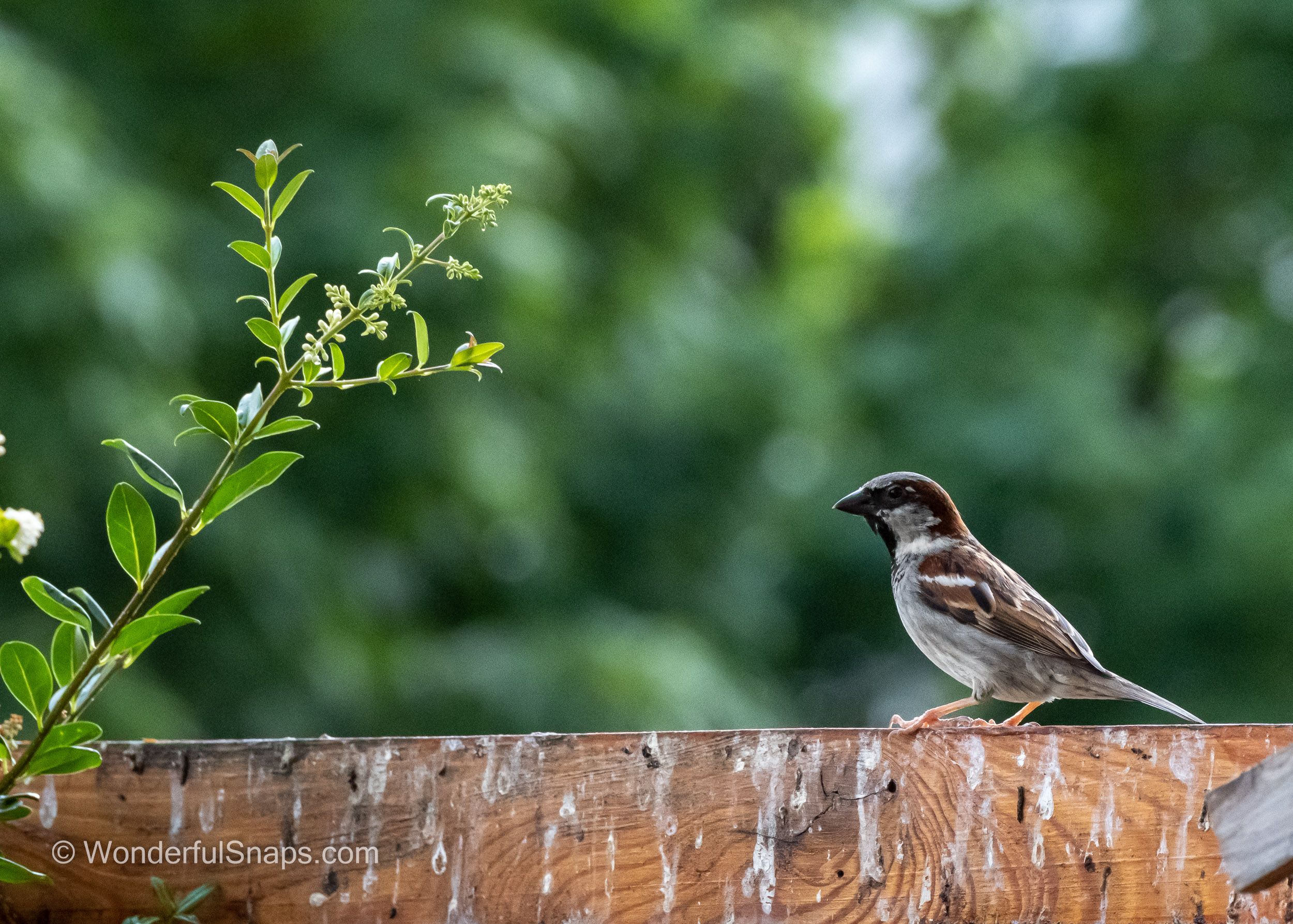 As I stood in the quiet garden, I was struck by the beauty of a small sparrow perched on the wooden fence. The sun was shining, casting a warm glow over the scene, and the sparrow's feathers seemed to shimmer in the light. I couldn't help but stop and take eight pictures of this tiny bird, capturing its every move and expression.