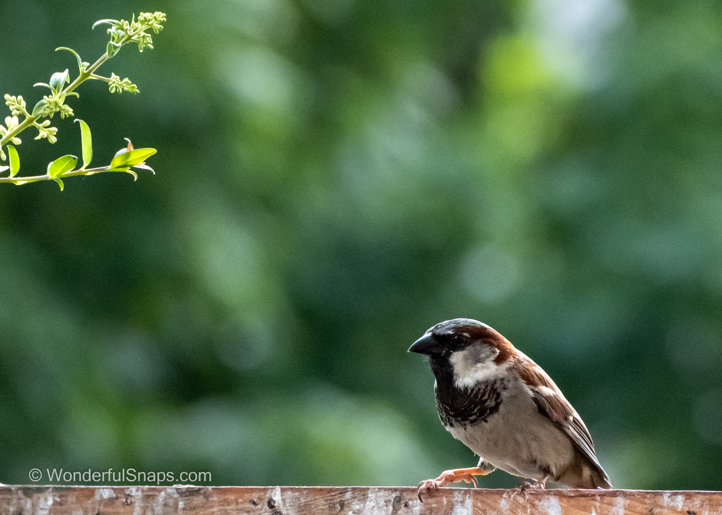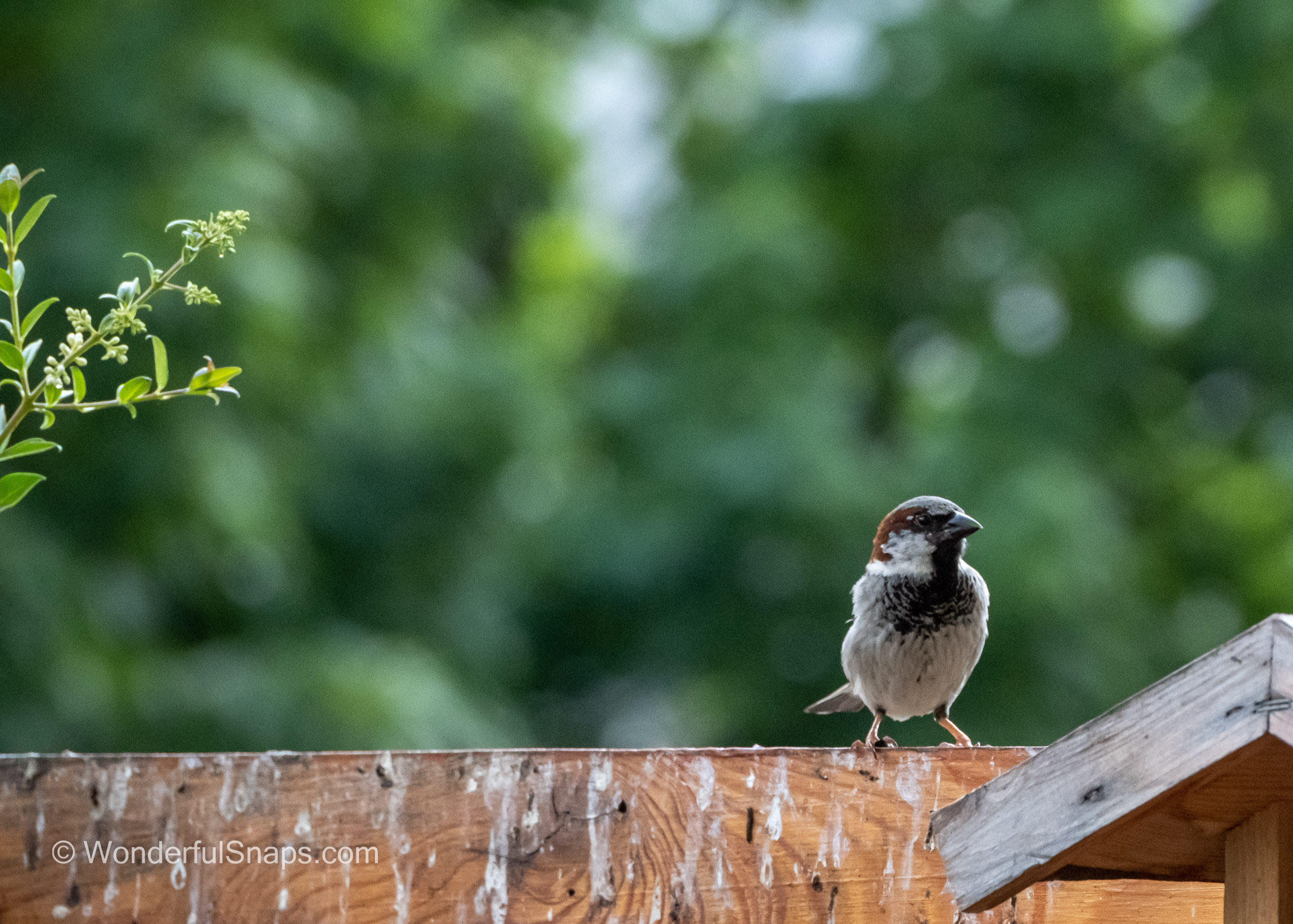 The sparrow's home was a humble abode, a small nest of twigs and leaves tucked away in the corner of the fence. But despite its modest surroundings, the bird itself was a picture of elegance. Its brown back and wings were perfectly feathered, with a subtle sheen that caught my eye. Its head was a delicate balance of grey and white, with a tiny black spot above its beak.
