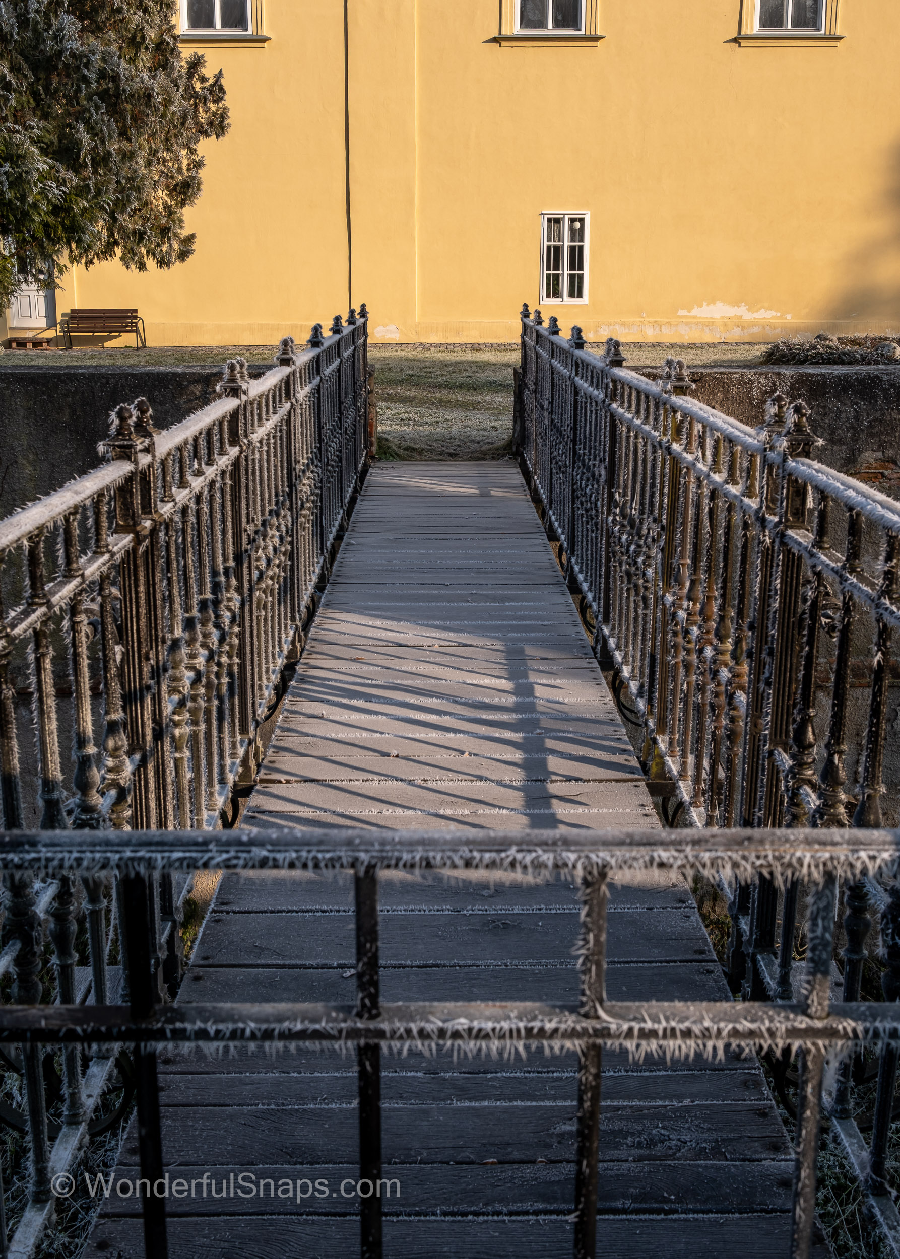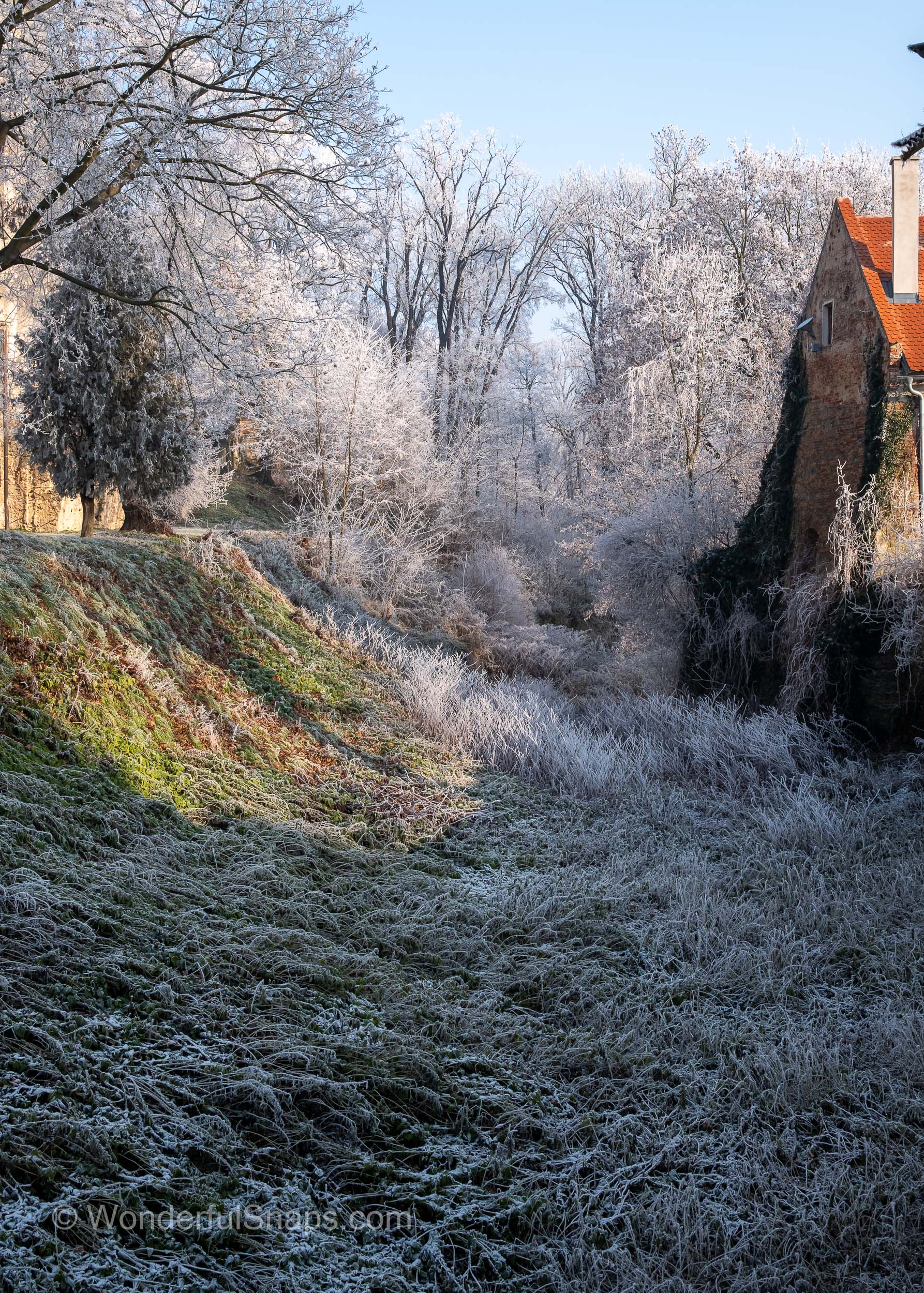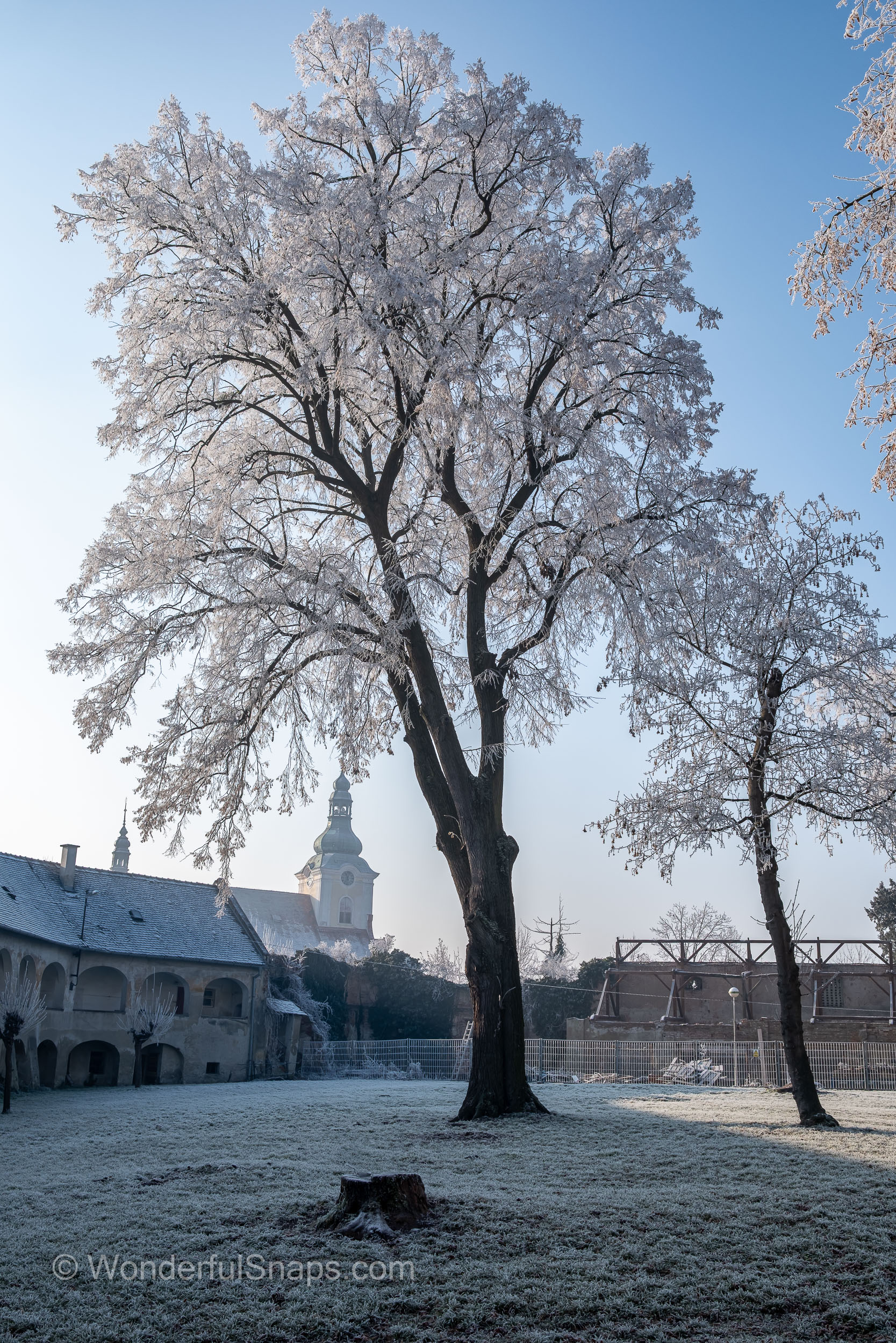 The sight of frozen trees in the castle’s backyard captures the spirit of the season — a moment when nature pauses in stillness and beauty. Every branch sparkles under a thin layer of ice, contrasting with the warm tones of the castle walls. The blend of architectural grace and natural purity creates an ethereal atmosphere that feels almost beyond time.