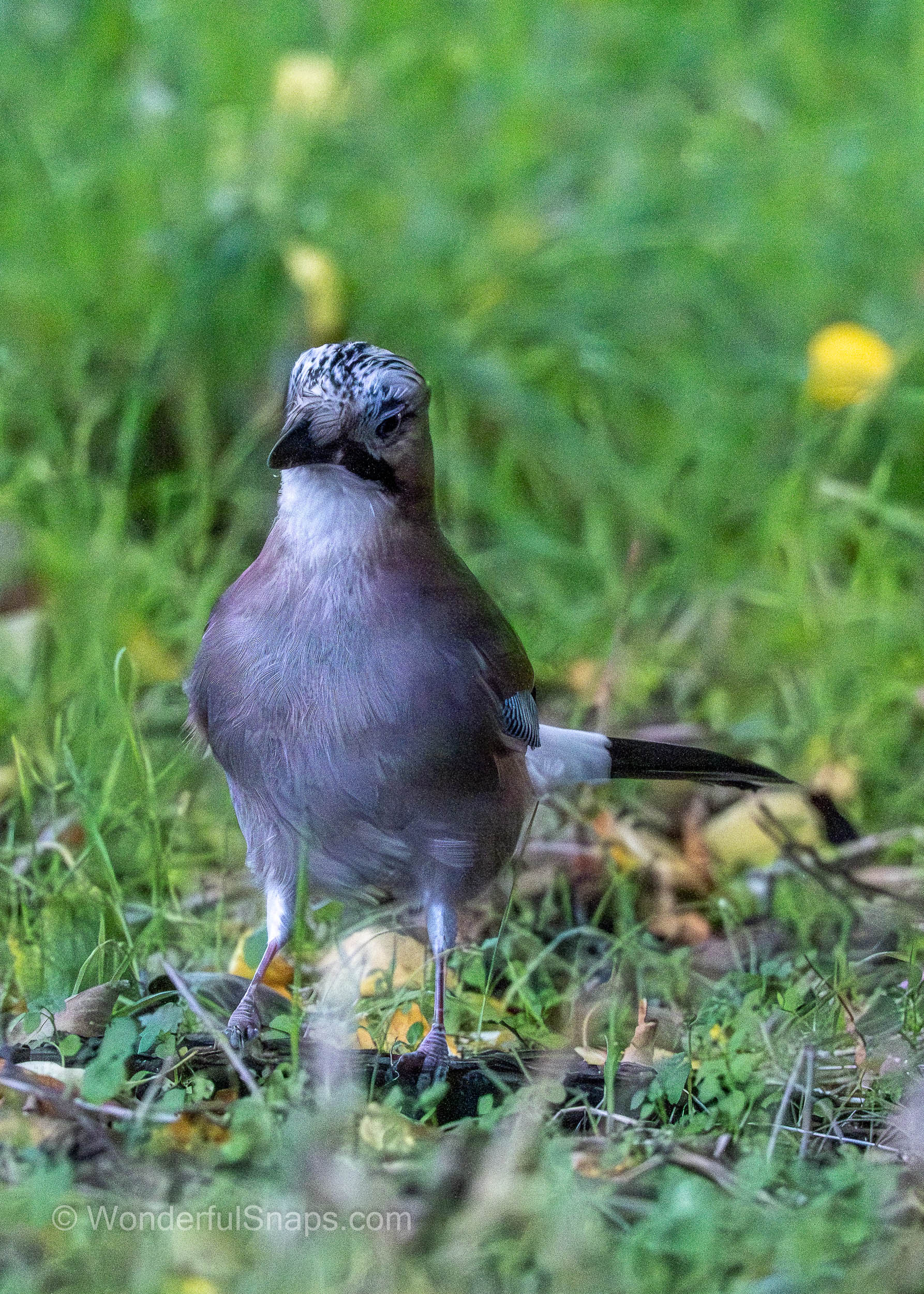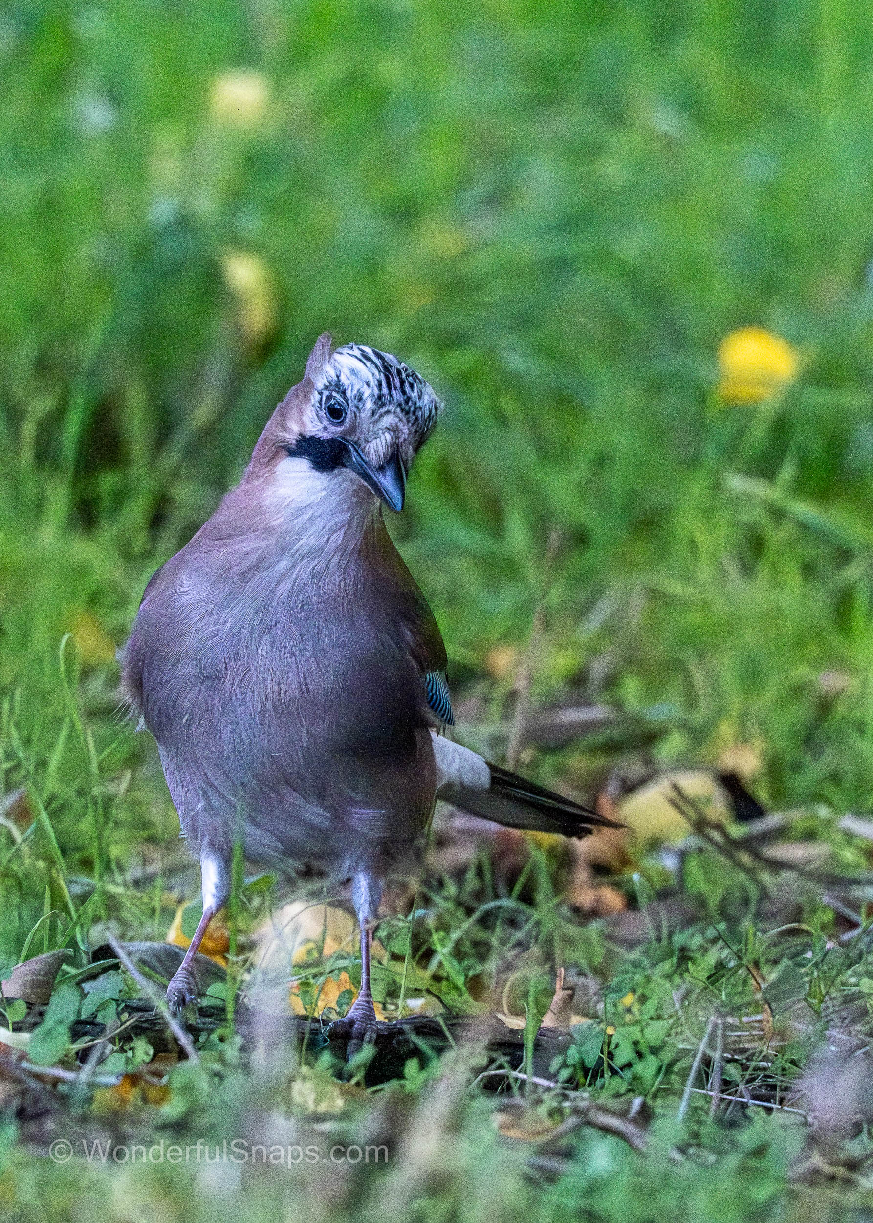 In these moments of the hunt, the jay demonstrated remarkable agility and awareness. It was seen hopping amongst the low-lying vegetation, frequently pausing to tilt its head and scan the surroundings with keen, dark eyes. This inquisitive posture is typical of the species, as they are known for their high intelligence and wary nature. The bird’s primary focus was the ground, where it used its sturdy black beak to peck at the soil and toss aside debris in search of food.