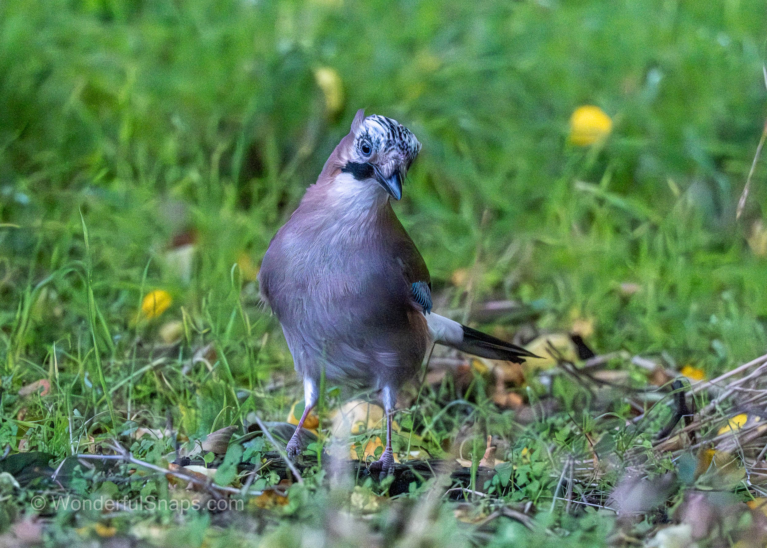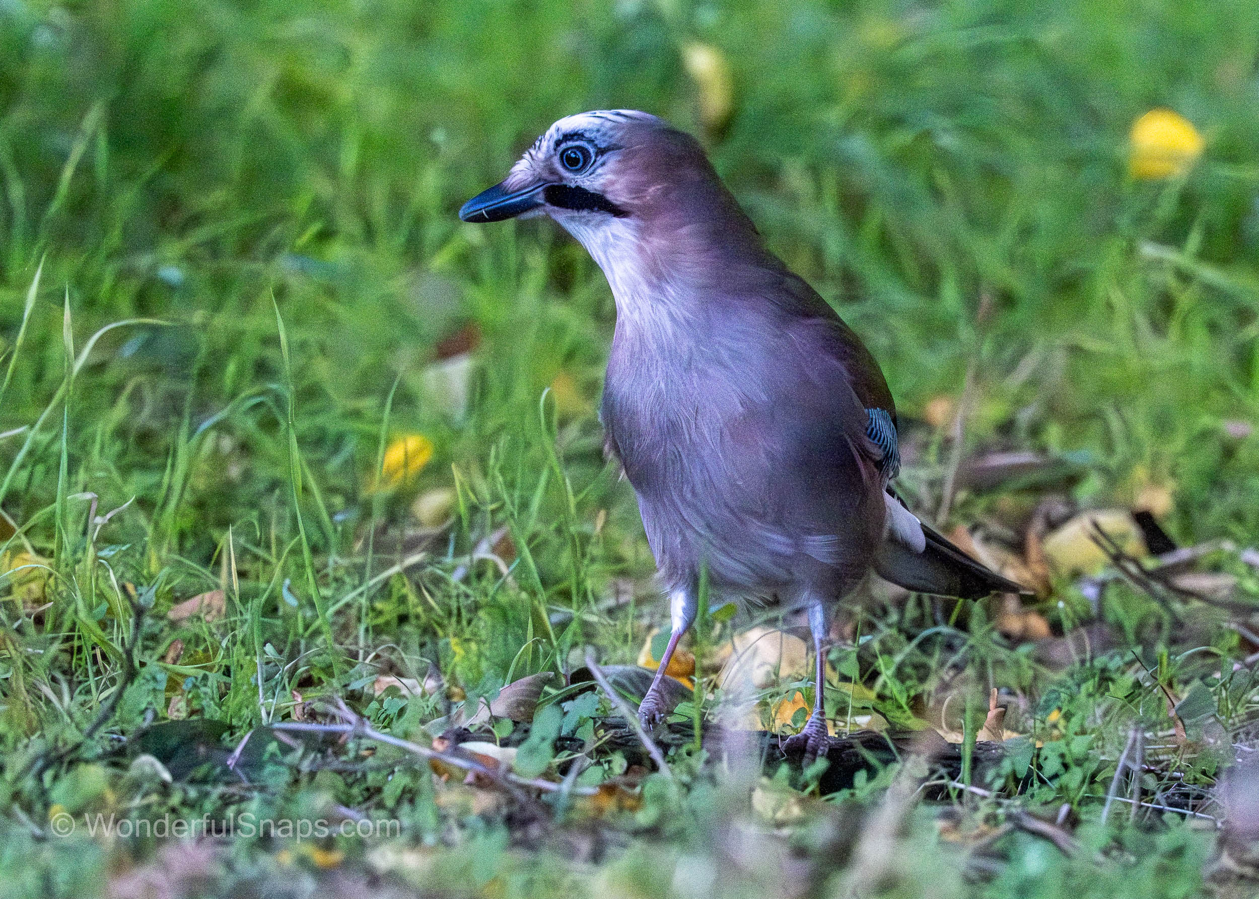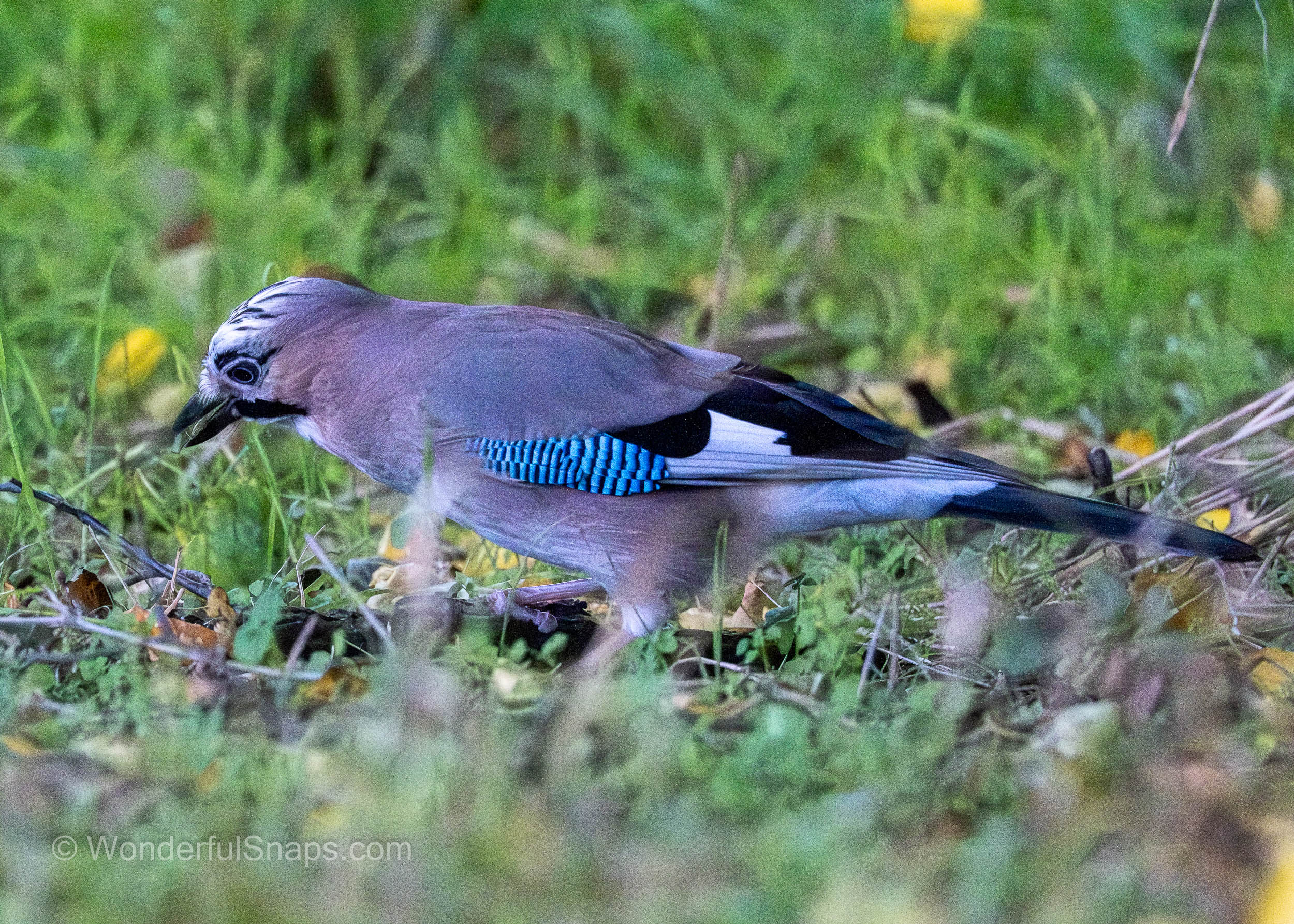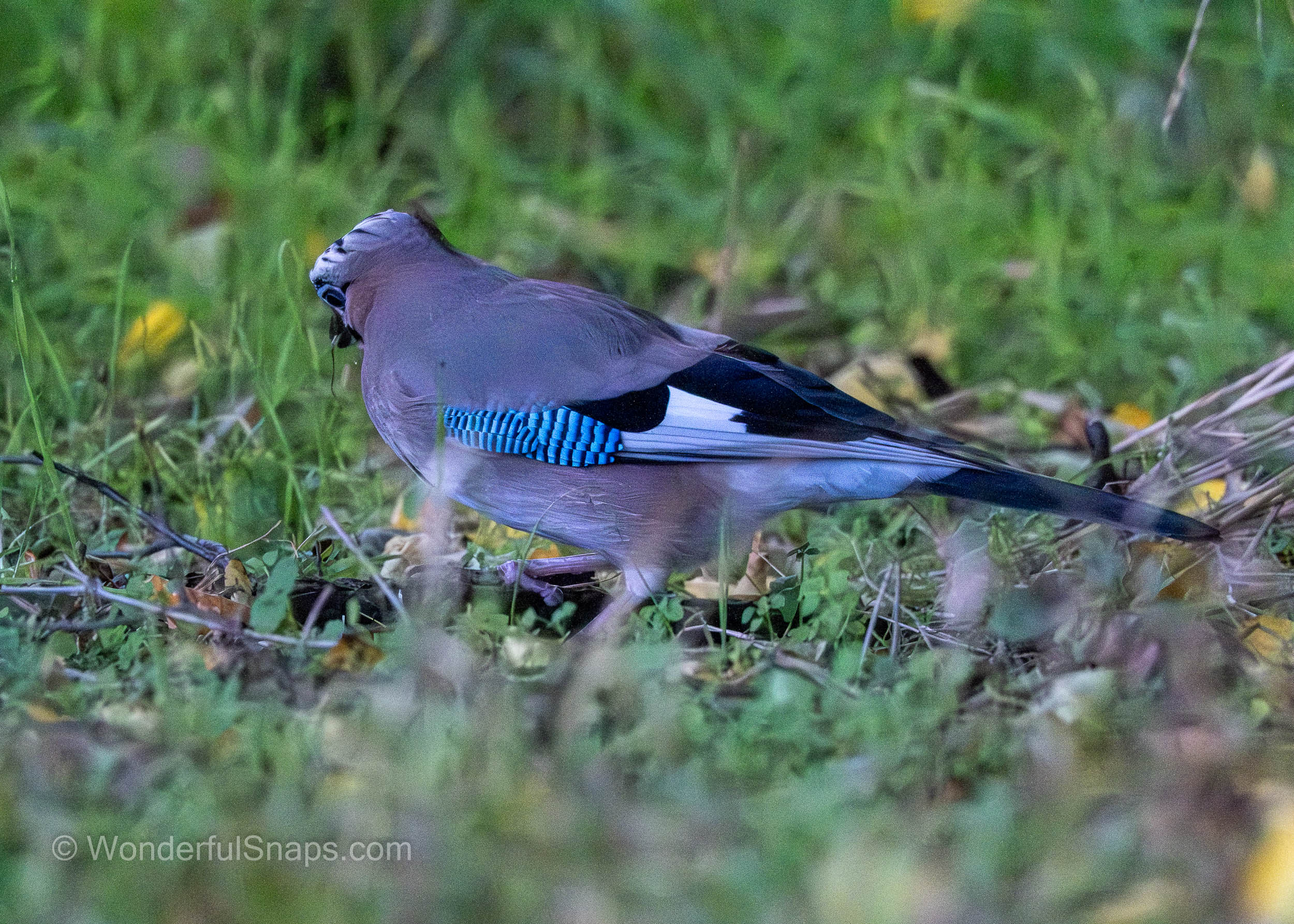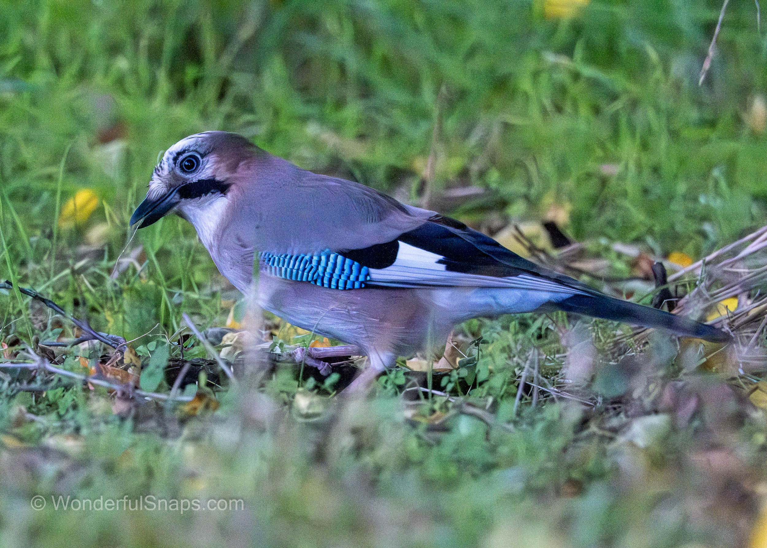 The Eurasian jay is instantly recognisable by its pinkish-brown body and the brilliant flash of azure blue on its wing coverts, which are marked with fine black bars. These vivid feathers provide a sharp contrast against the earthy tones of the autumn grass and fallen leaves. As it moved through the undergrowth, the bird’s black "moustachial" stripe and the intricate black-and-white patterns on its crown were clearly visible, highlighting the unique aesthetic of this member of the crow family.