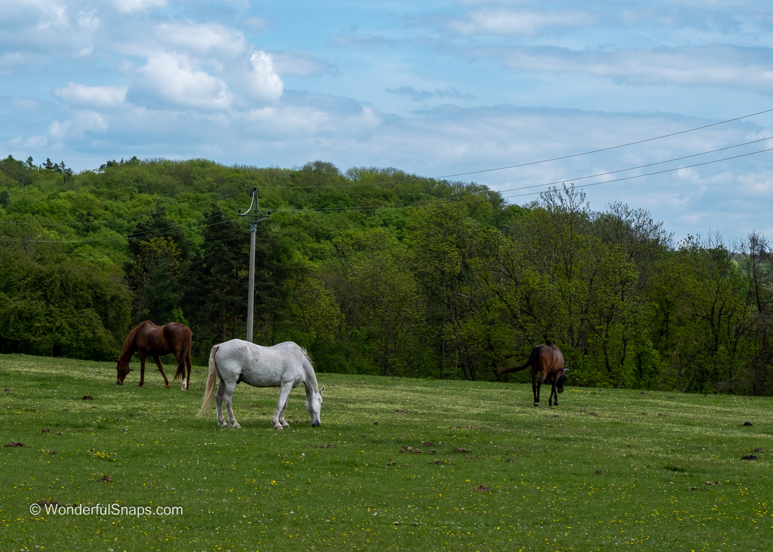 In one frame, horses graze with contentment in the lush meadow. Their graceful movements and elegant postures are a testament to their serene presence. With delicacy, they nibble on the verdant grass, creating a scene of tranquillity and natural harmony.
